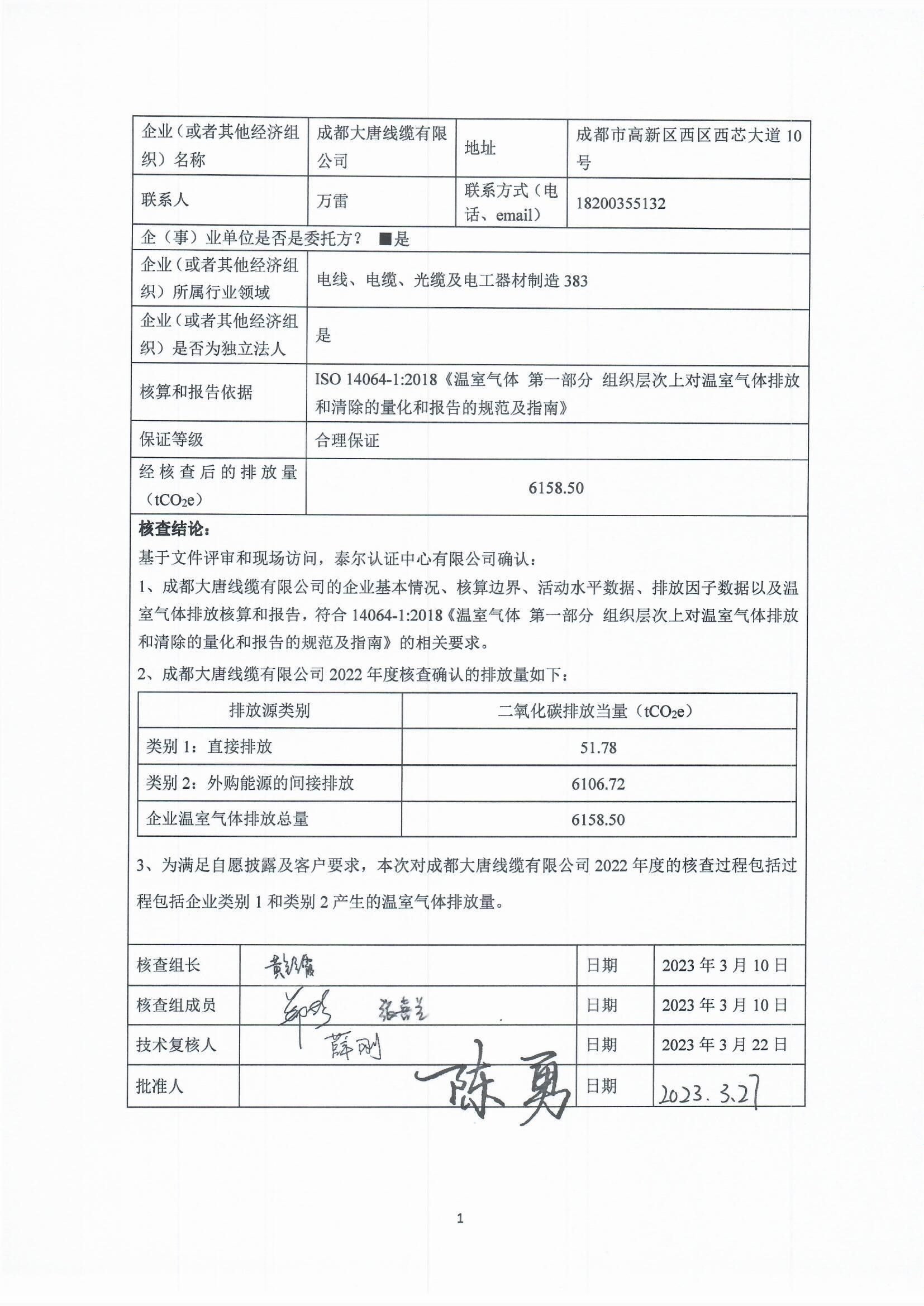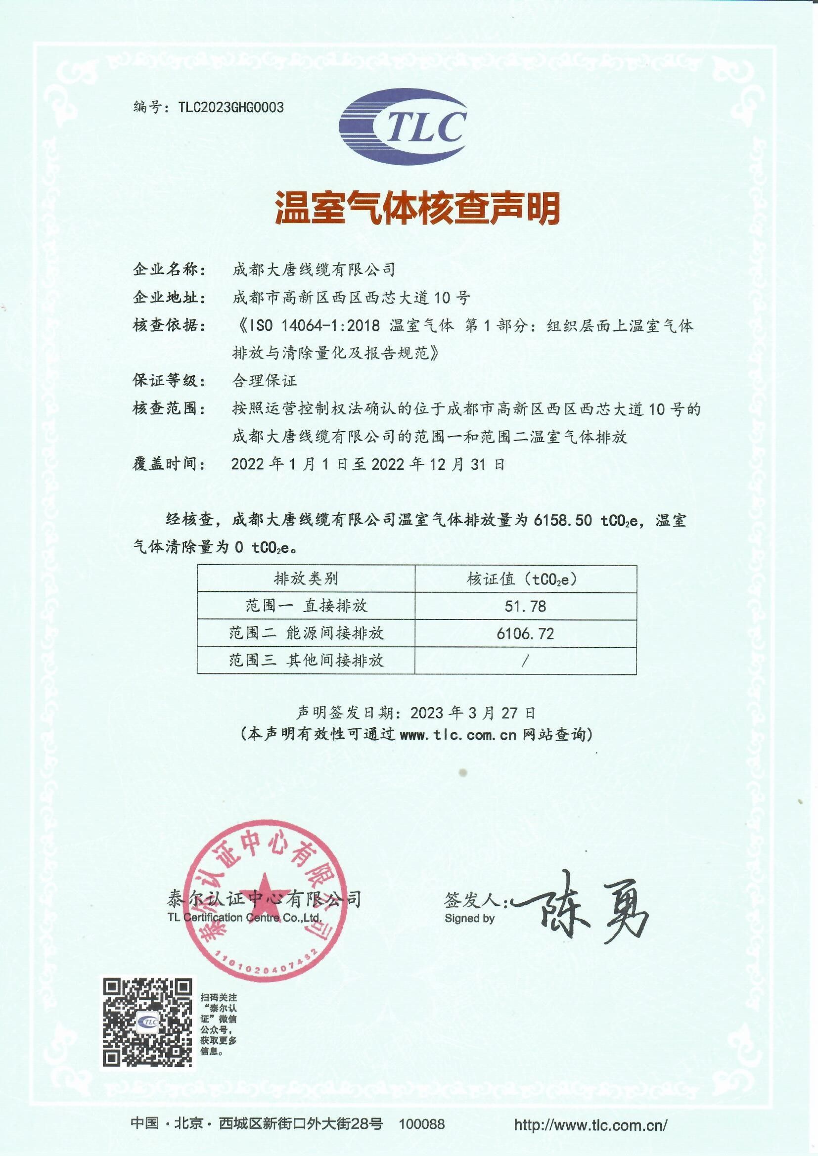 本公司核查边界为按照运营控制权法确认的位于成都市高新区西区西芯大道10号的成都大唐有限公司的范围一和范围二温室气体排放。本报告的数据覆盖期间为2022年1月1日至2022年12月31日。