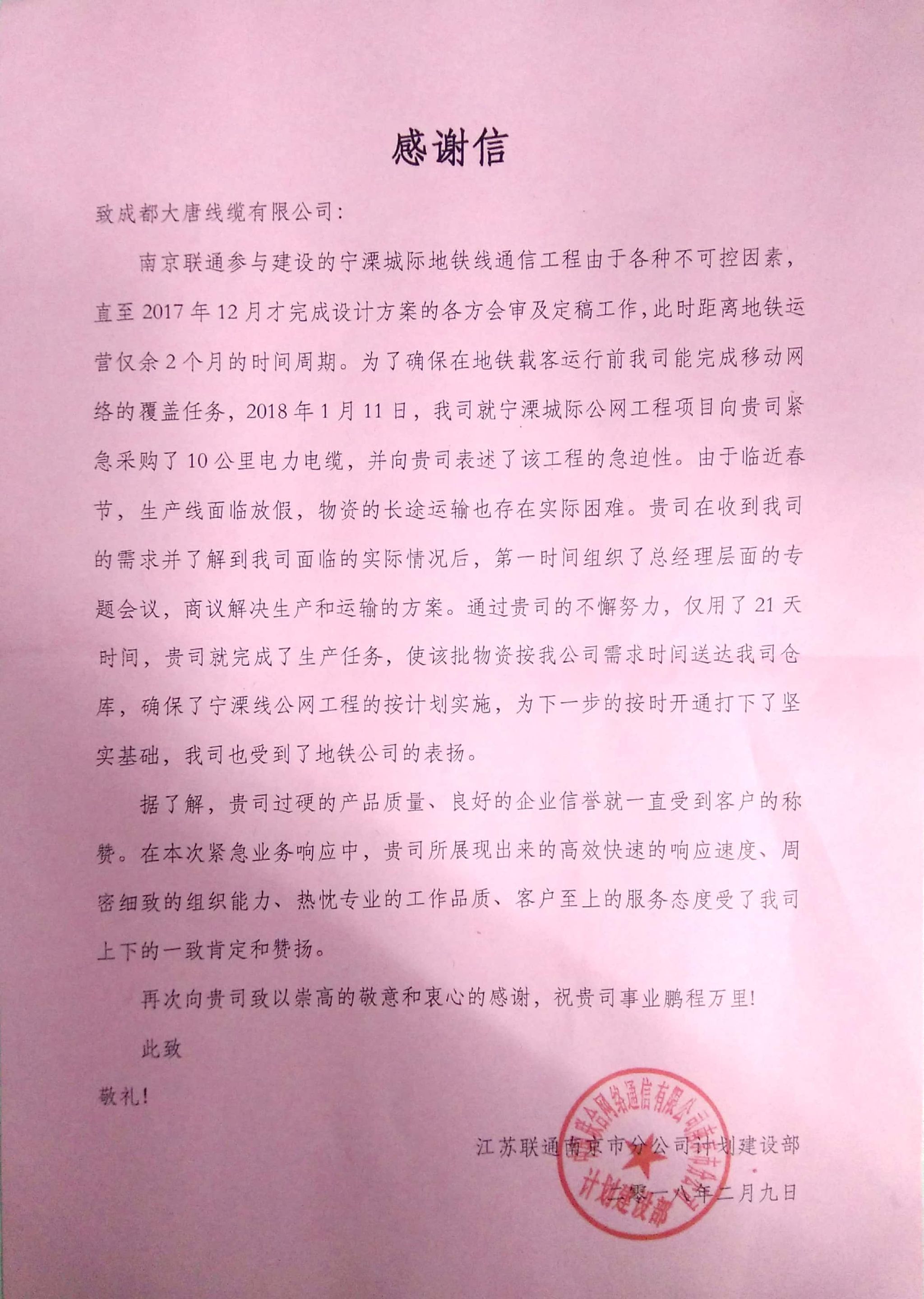 南京联通表扬信