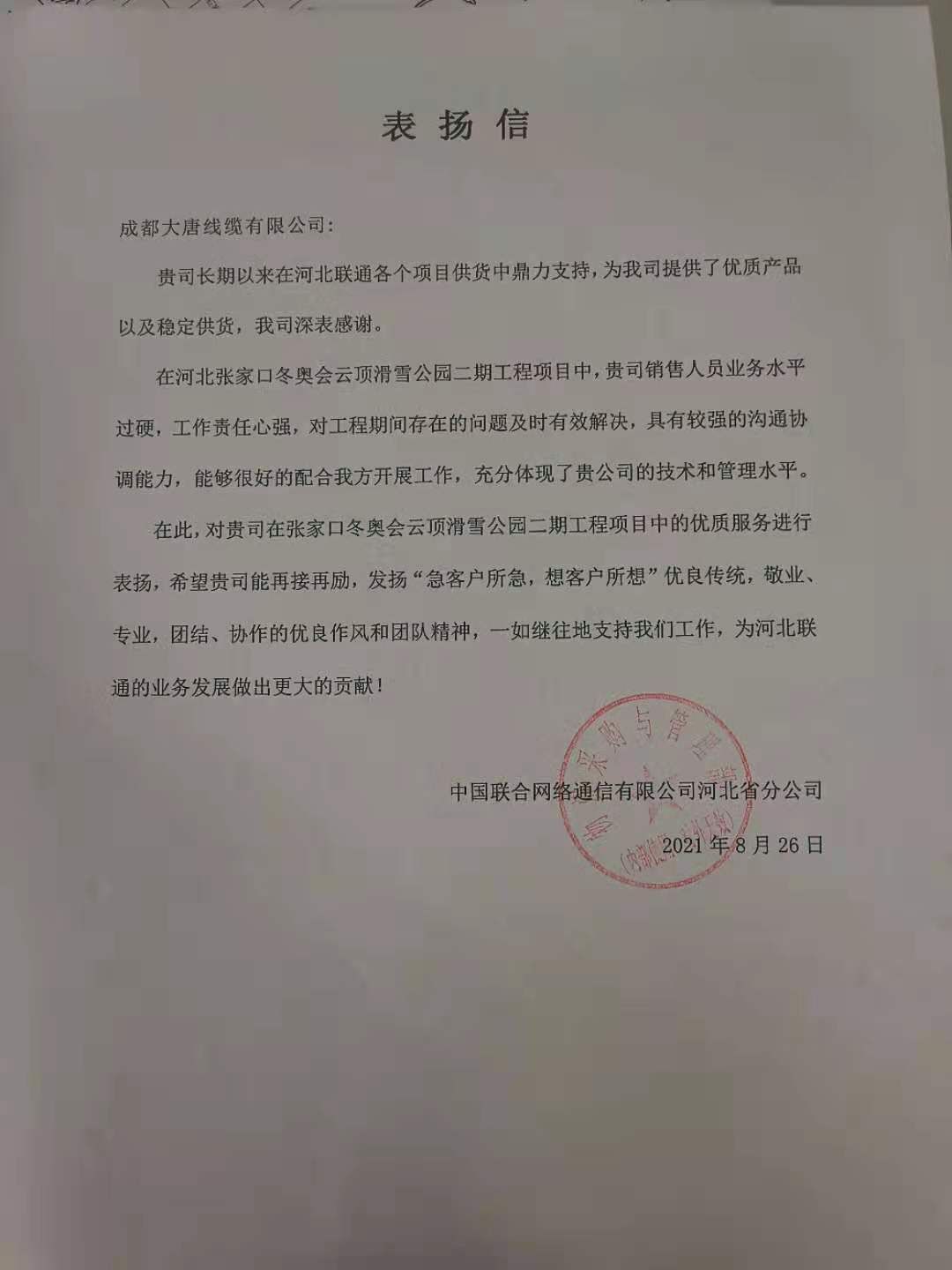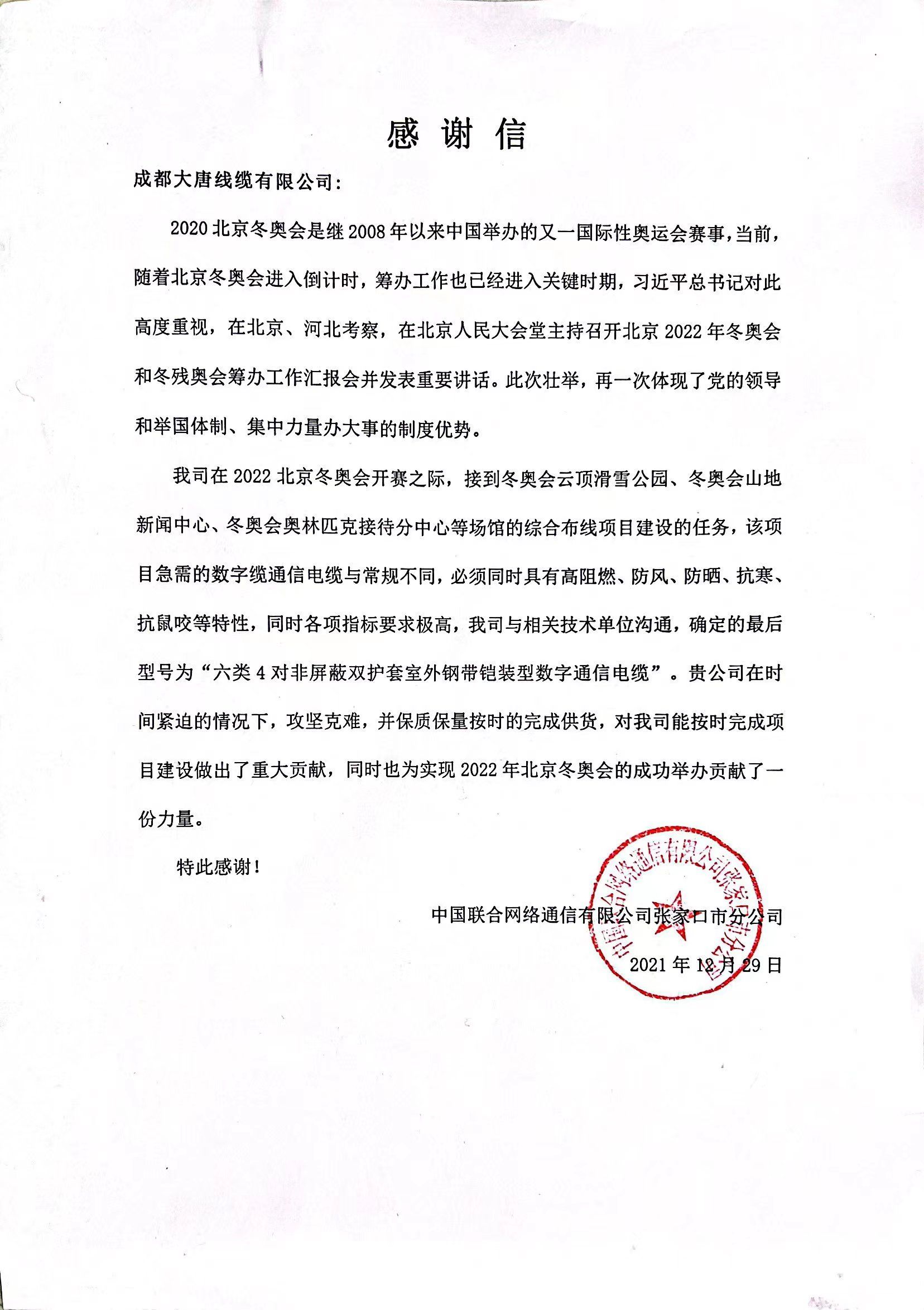 张家口联通感谢信(冬奥北京场馆建设)
