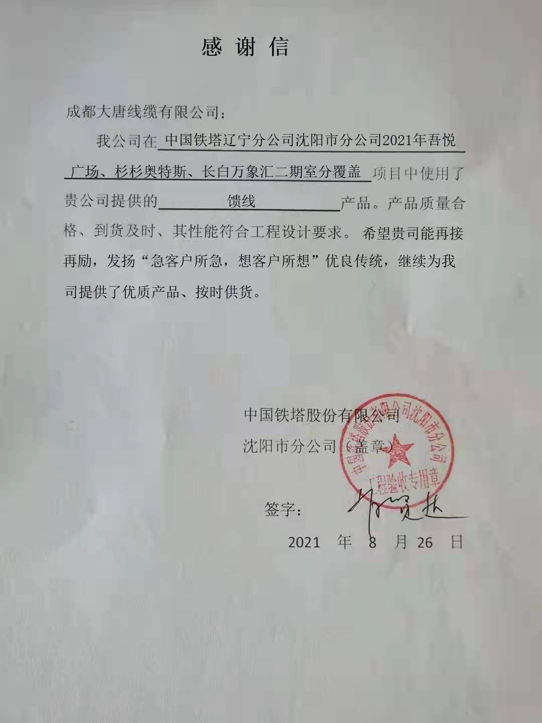 沈阳铁塔感谢信