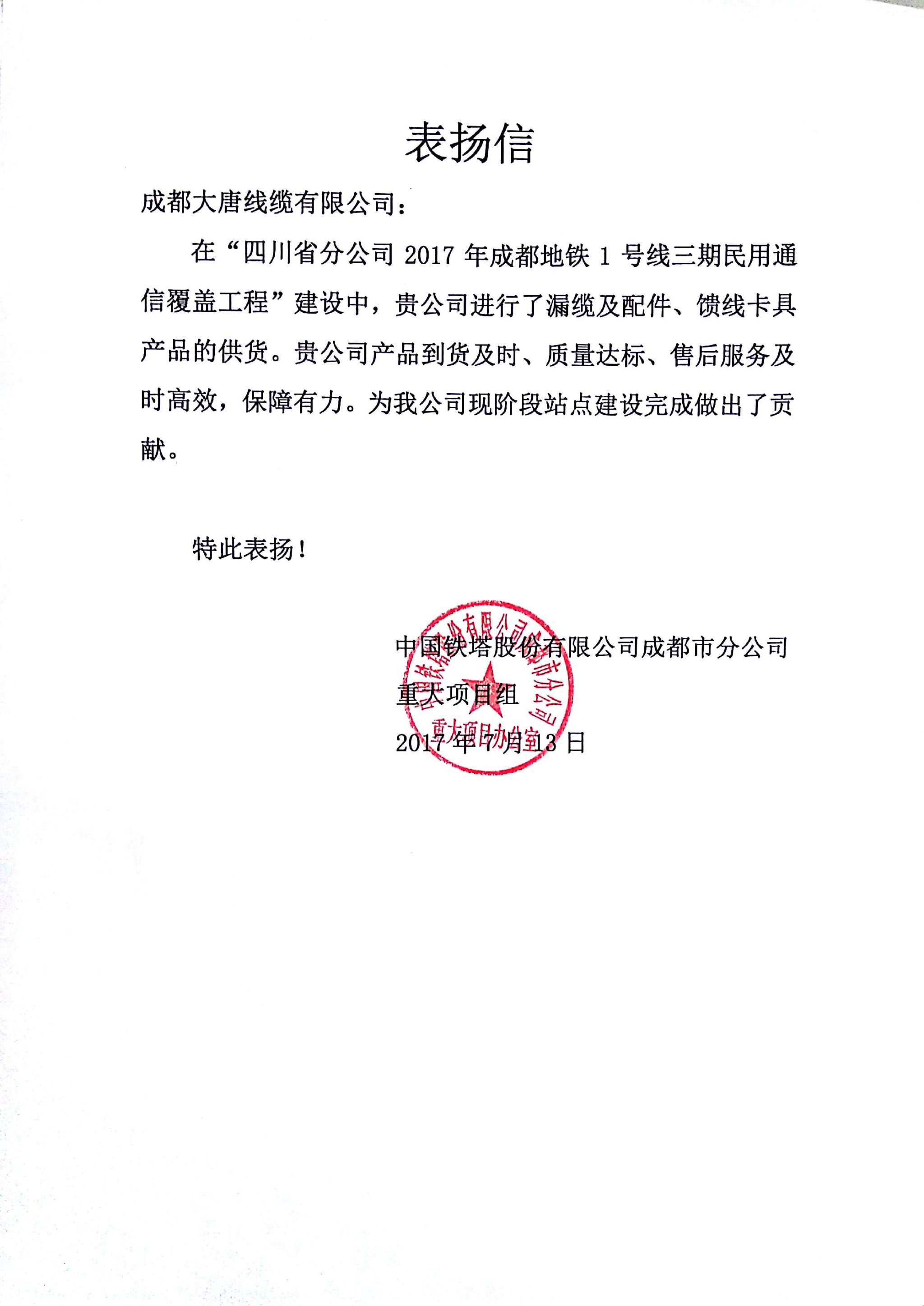 成都铁塔表扬信